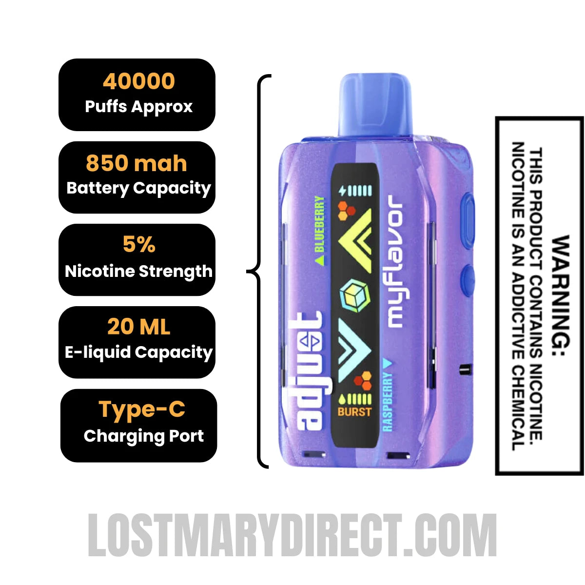 Blue Razz Ice Adjust MyFlavor 40k Disposable Vape is here to elevate your vaping experience, now available at Lostmarydirect, this next-gen vape combines the icy chill of cool menthol with the tangy sweetness of blue raspberry and the luscious taste of mixed berries for a flavor explosion you won’t forget. Designed for flavor lovers like you, this cutting-edge device delivers an unbeatable mix of convenience, customization, and performance. Whether you’re a casual user or a seasoned enthusiast, we offer this device to redefine your expectations with its advanced features and a burst of bold flavor.