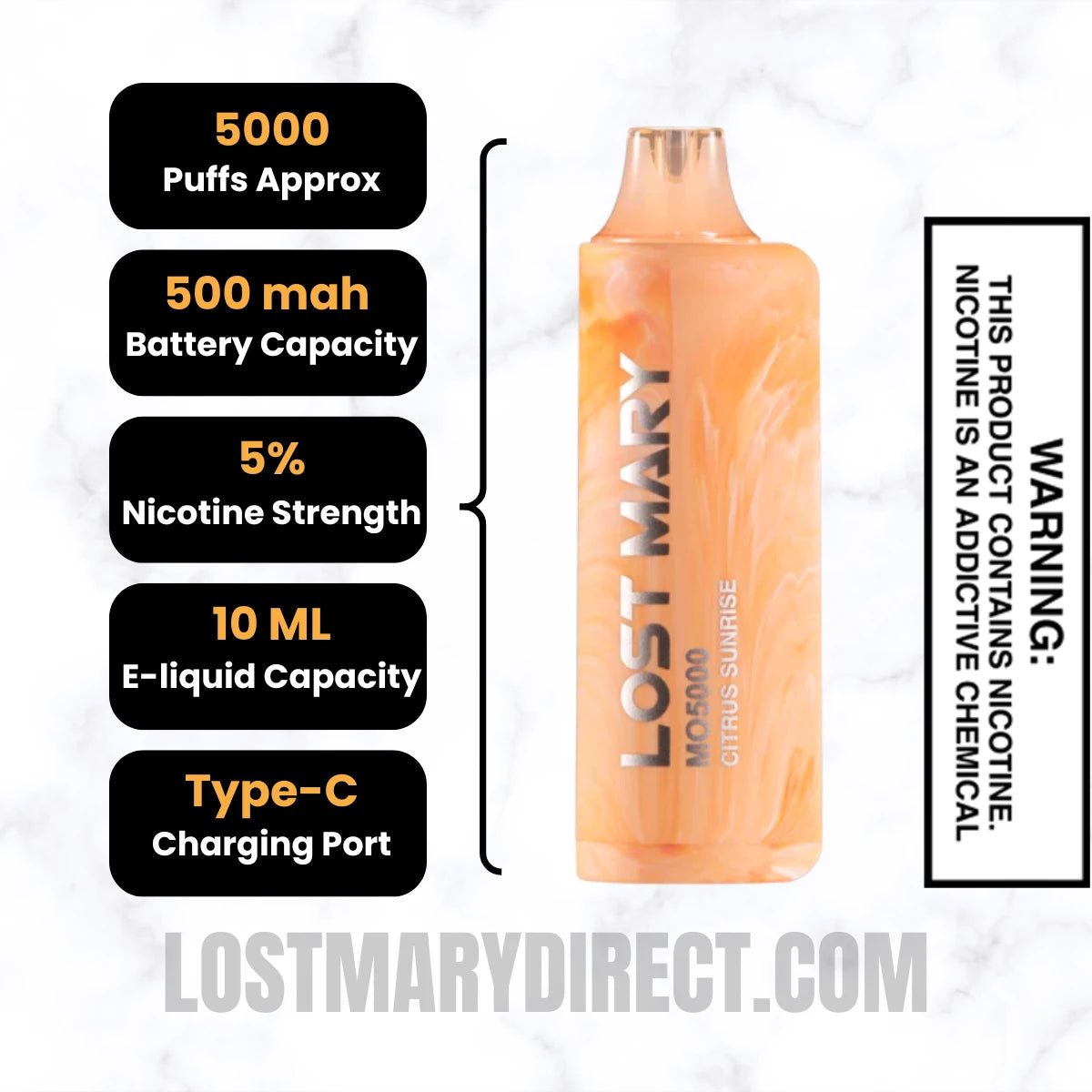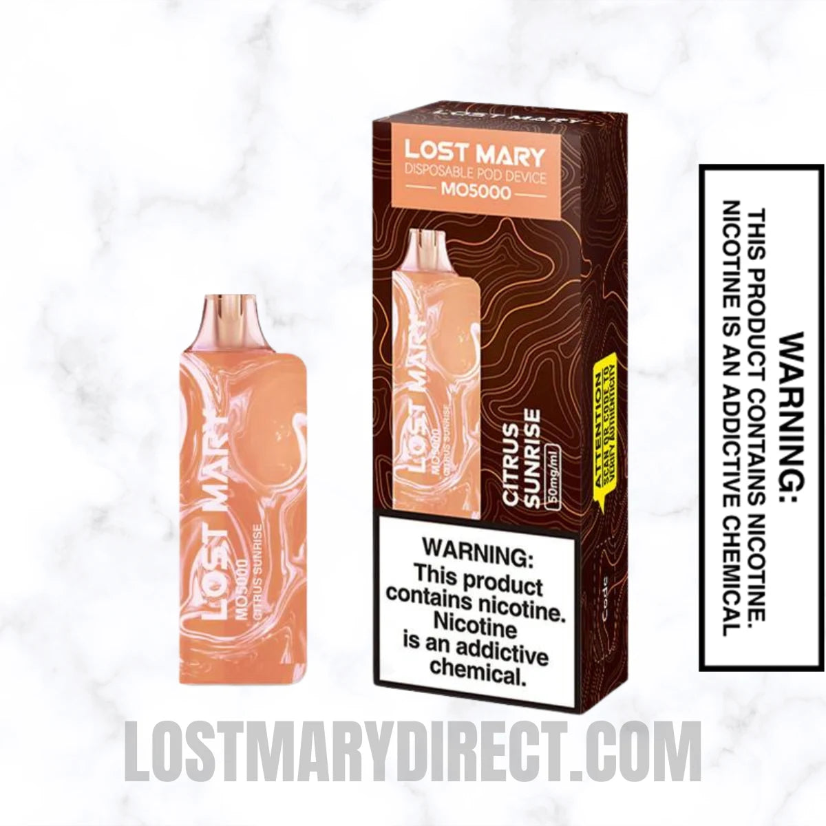 Each Citrus Sunrise Lost Mary MO5000 device contains a nicotine concentration of 5% (50mg) per volume. This concentration is consistent across the device’s lifespan, providing a steady and predictable experience.