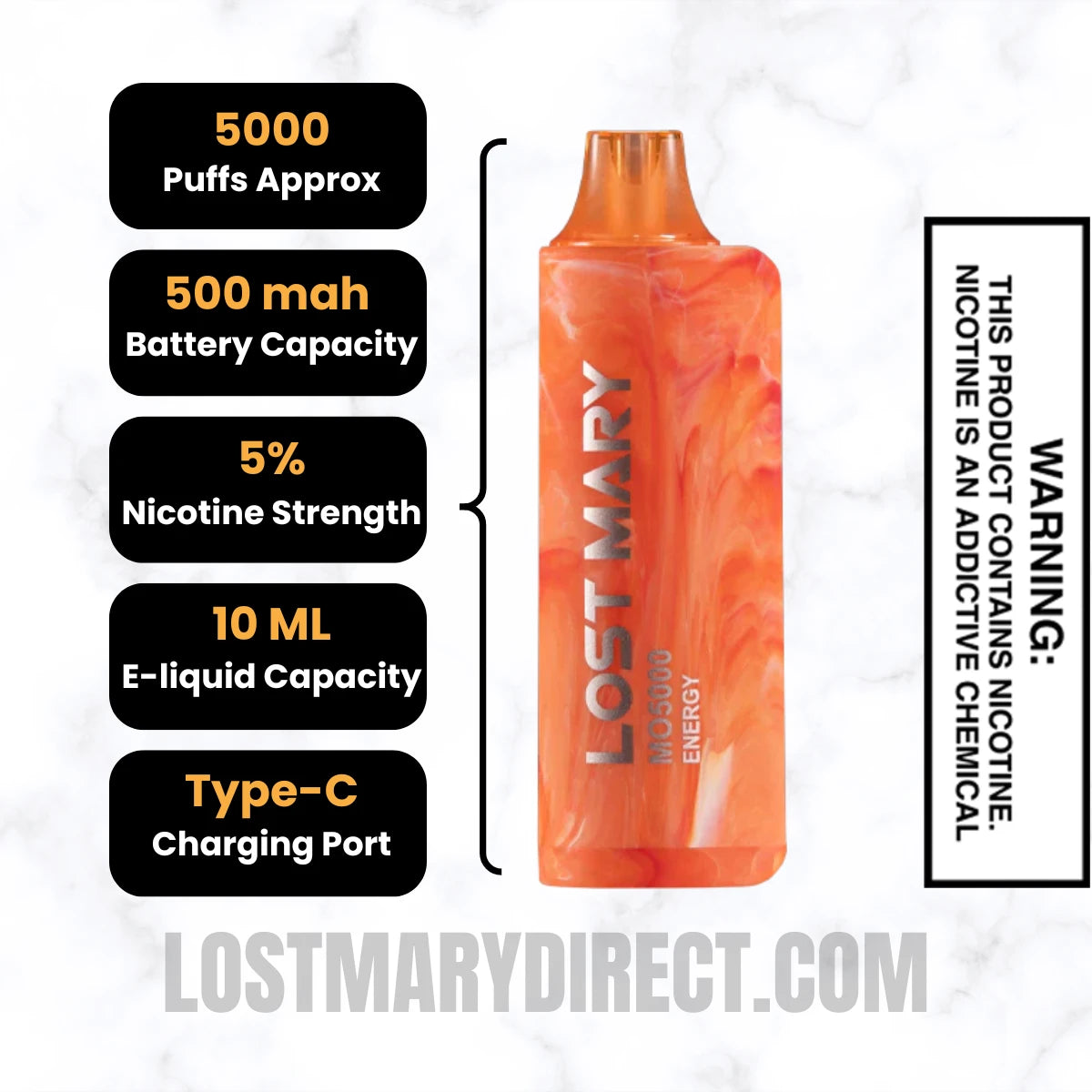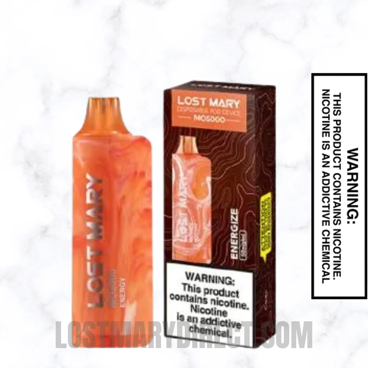 Energize Lost Mary MO5000 contains a nicotine strength of 5% by volume. This equates to 50mg of nicotine per ml, providing a consistent experience across all 5000 puffs.