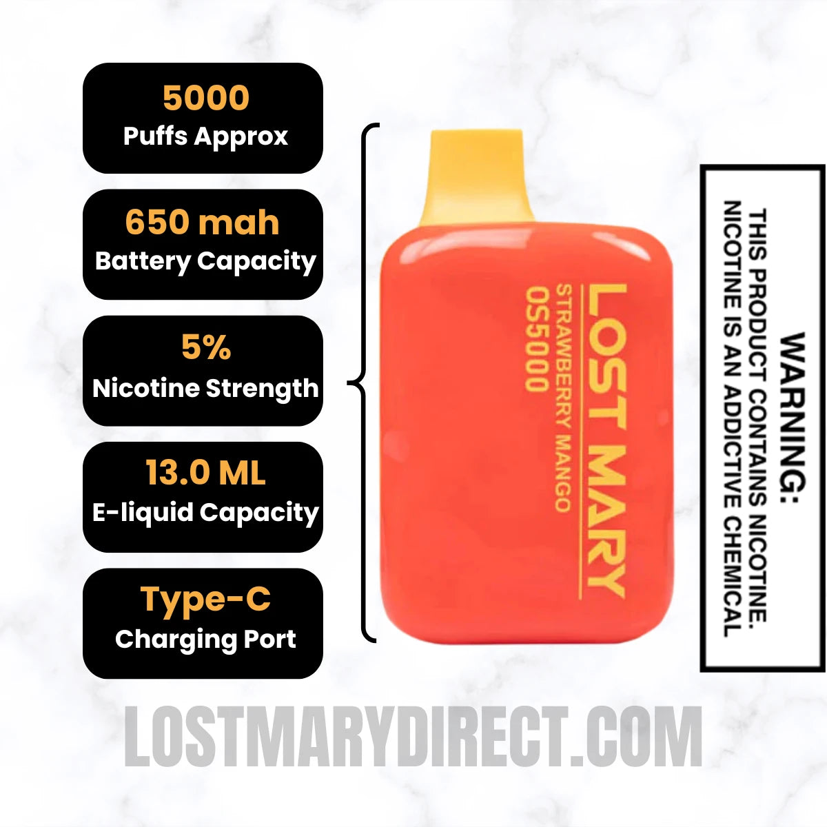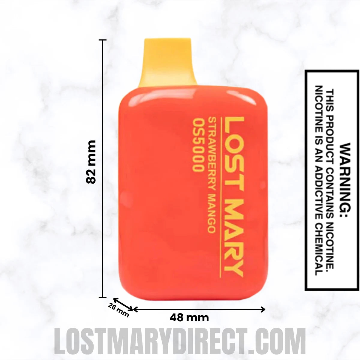 The Strawberry Mango Lost Mary OS5000 contains a nicotine concentration of 5% (50mg) by volume. This level is consistent across each puff, providing a balanced and enjoyable experience for adult smokers looking for an alternative to traditional cigarettes.