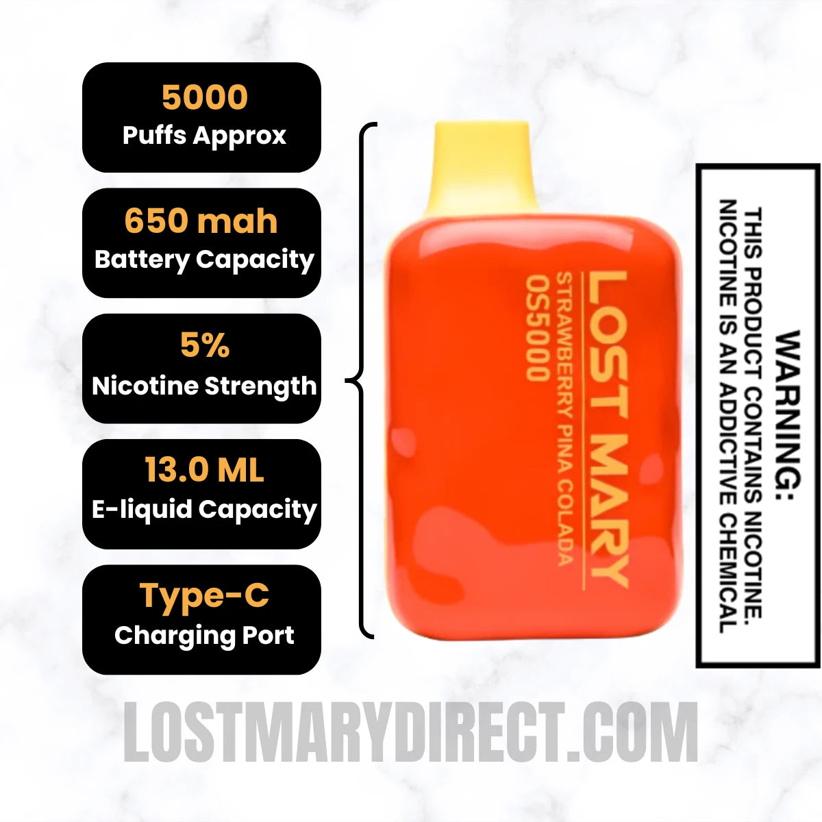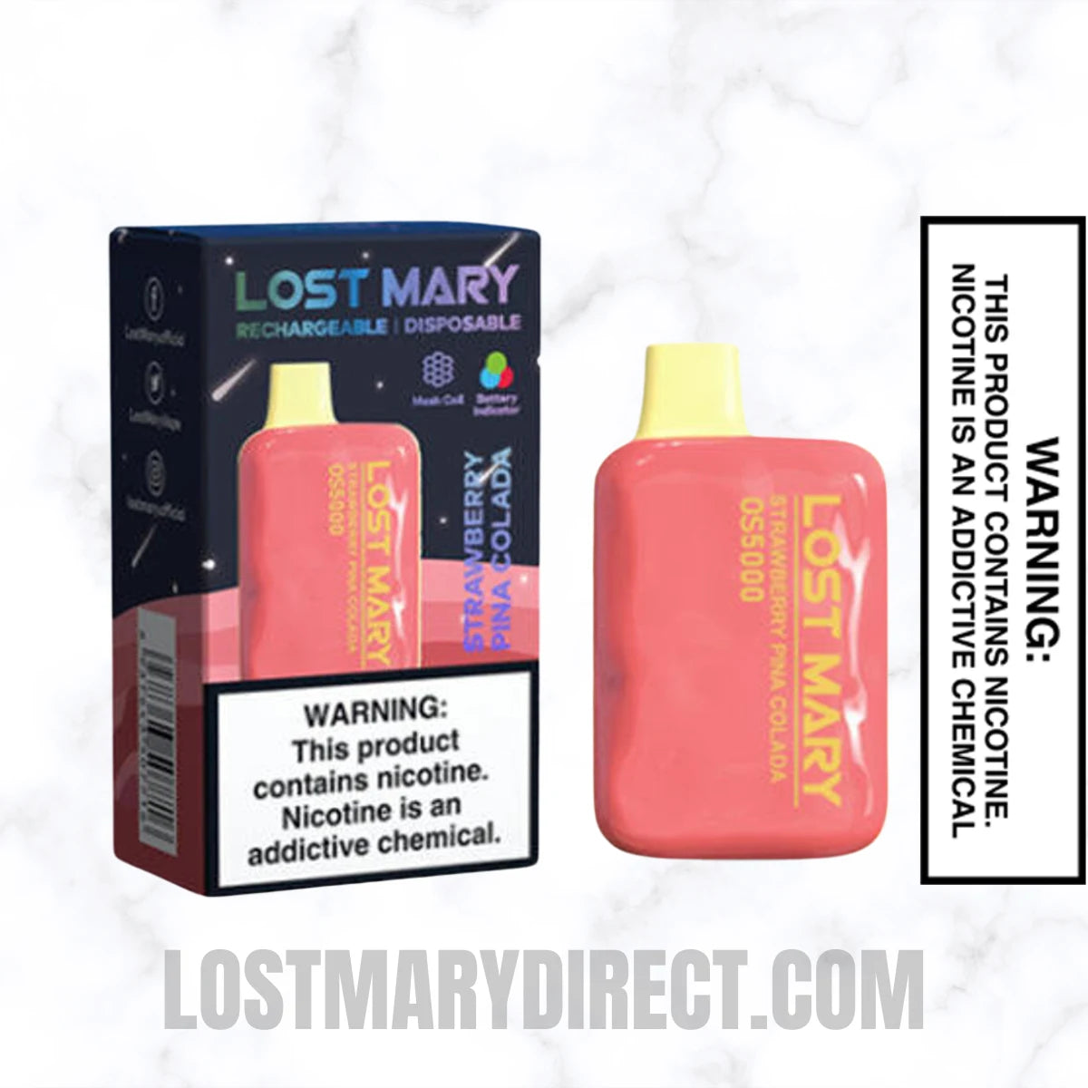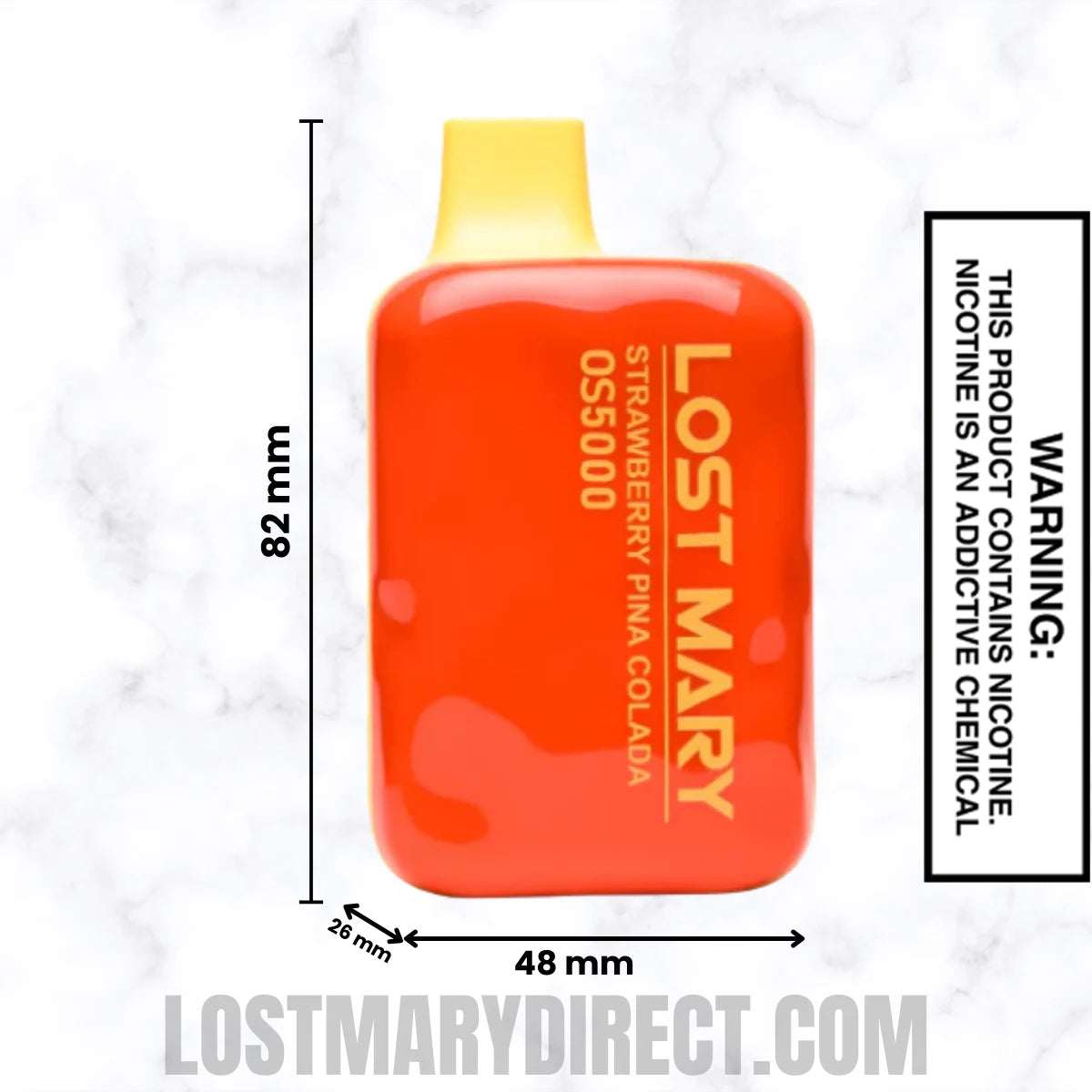 Strawberry Pina Colada Lost Mary OS5000 Disposable Vape brings a tropical twist to your vaping experience. Enjoy the delicious flavor of Strawberry Pina Colada, which puts a twist on the traditional pina colada vape by adding sweet strawberry to a pineapple and coconut cream base. This disposable vape offers you a generous 13.0 mL e-liquid capacity and 5% nicotine (50mg/ml) for a rich, satisfying hit. Its sleek design, measuring 48mm x 26mm x 82mm, makes it perfect for your on-the-go use. With a powerful 650mAh battery and a convenient Type-C charging port, quick recharges are effortless. Enjoy Lost Mary Strawberry Pina Colada OS5000 disposable Vape, delicious flavor thanks to the advanced mesh coils. Experience unparalleled convenience and top-notch quality with Lost Mary Direct.