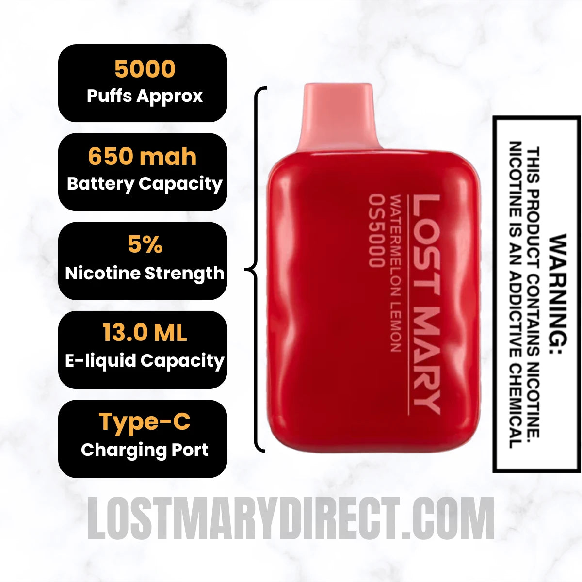 Each Watermelon Lemon Lost Mary OS5000 contains a nicotine strength of 5% by volume. This level is consistent across the device, providing a steady and satisfying experience with each puff.
